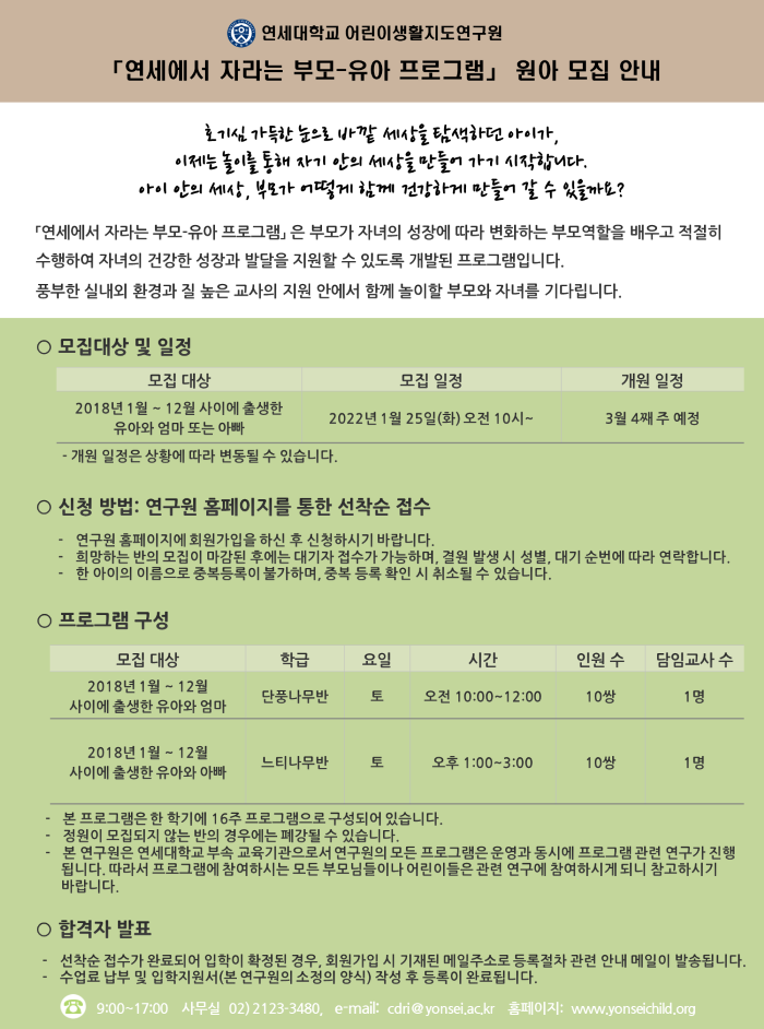 2022년도「연세에서 자라는 부모-유아 프로그램」모집 안내