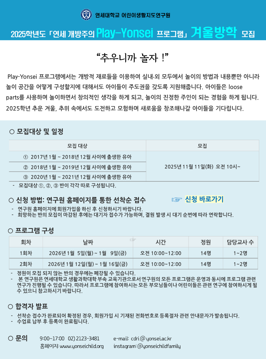 2025학년도「연세 개방주의 Play-Yonsei 프로그램」겨울방학 모집 안내