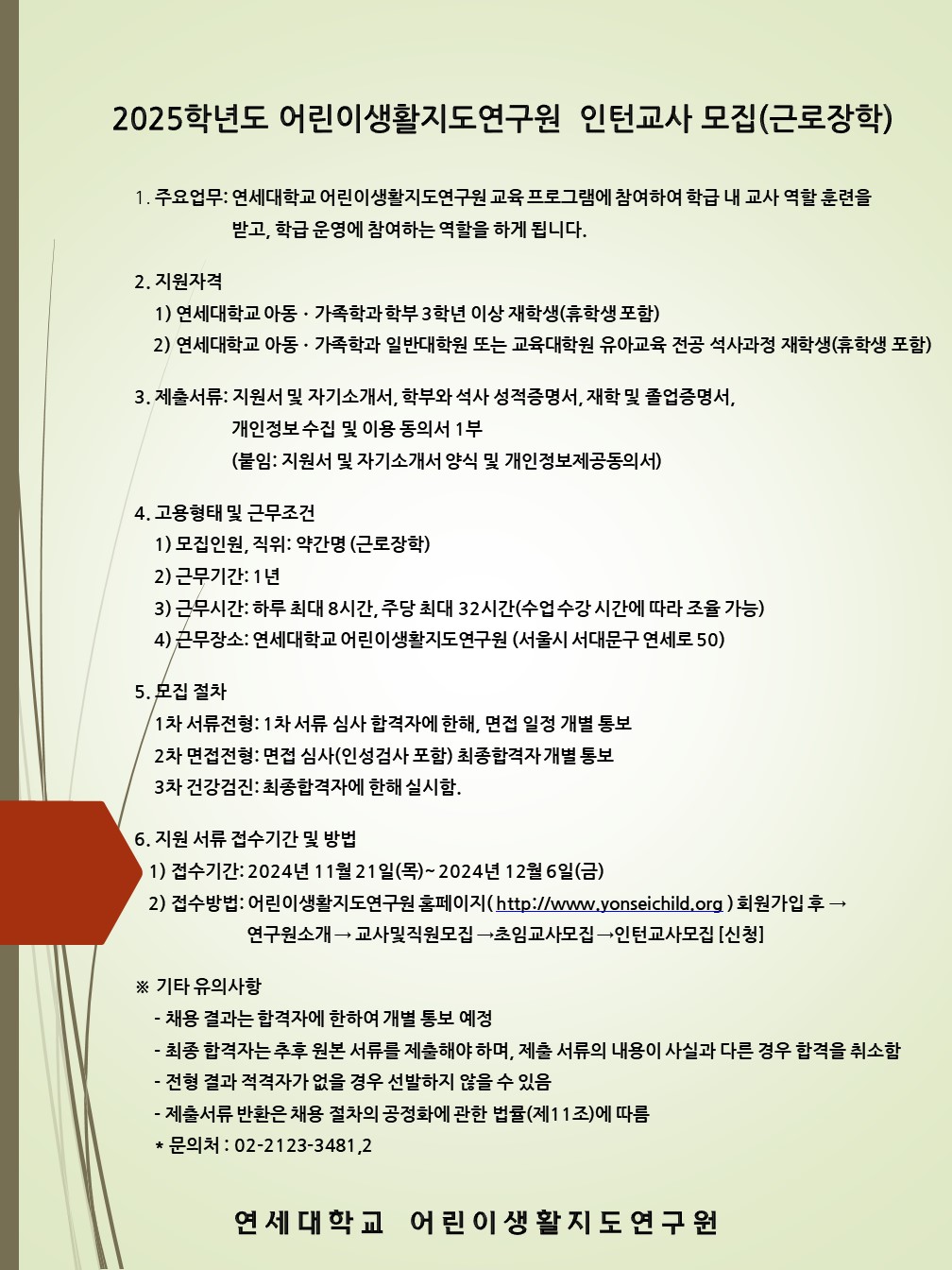 (마감) 2025학년도 어린이생활지도연구원 인턴교사 모집(근로장학)
